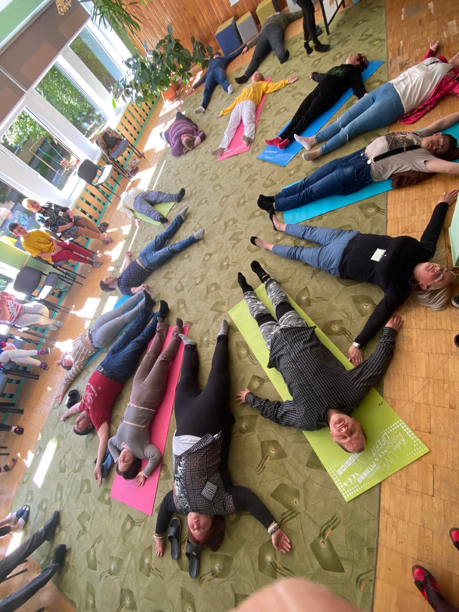 Grupinės mankštos vyksta mažomis grupelėmis po 4-5 paslaugų gavėjus arba organizuojama bendra visos įstaigos mankšta.